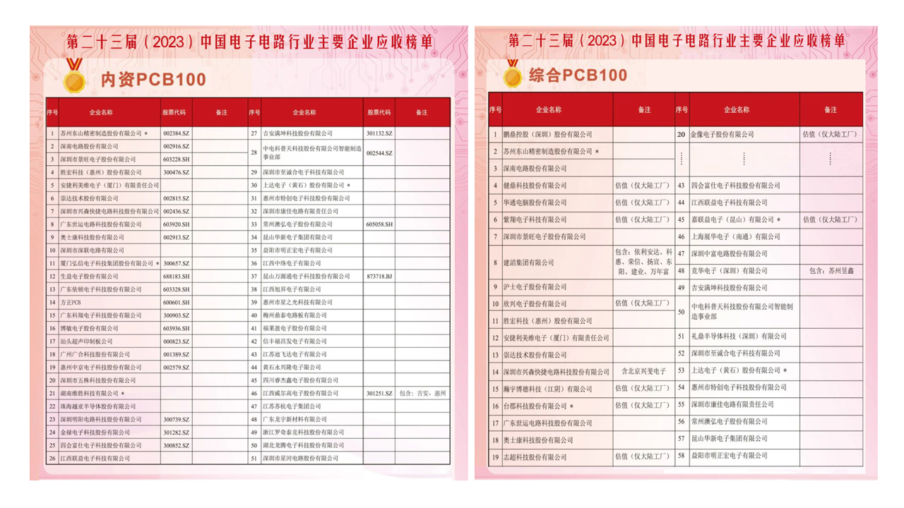 近期,中国电子电路行业协会(CPCA)正式发布了《第二十三届(2023)中国电子电路行业主要企业营收榜单》。JDB电子游戏科技凭借稳健坚韧的市场表现与综合实力荣登2023年度内资PCB百强榜单第4名,同时在综合PCB排名中位列第11名。
