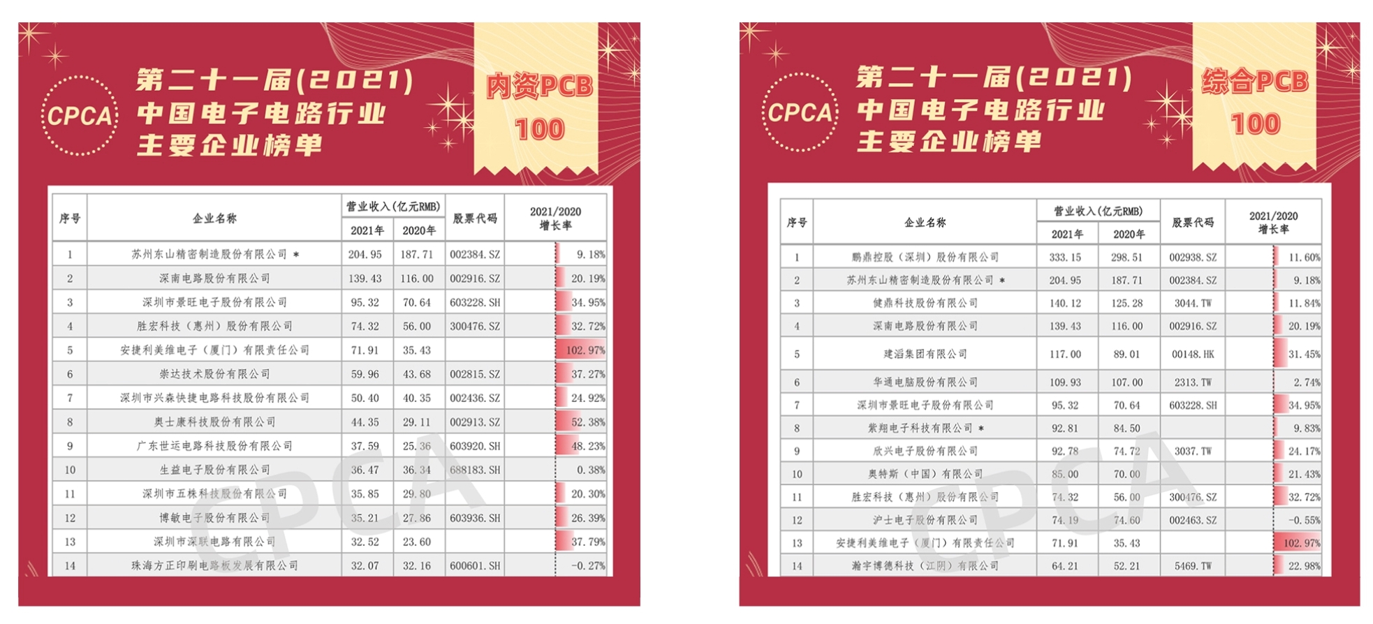 5月18日,由中国电子信息行业联合会和中国电子电路行业协会联合发布的第二十一届(2021)中国电子电路行业主要企业榜单正式发布。榜单中设有综合PCB百强企业排行、内资PCB百强企业排行、覆铜箔板企业排行等10个子榜单,共计有241家企业上榜。其中JDB电子游戏科技以74.32亿元的营收位居中国综合PCB榜单第11名,内资第4名。